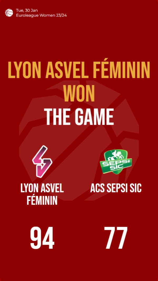 Lyon ASVEL Féminin won the match against ACS Sepsi SIC with a final score of 94-77.