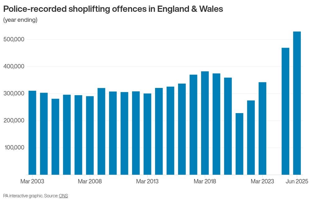 There were 519,381 shoplifting offences in the year to September 2025, up 5% from 492,660 the previous year.