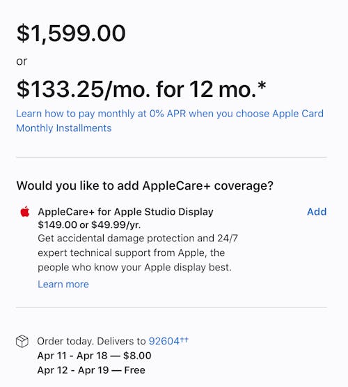 The Studio Display fairs somewhat better. The cheapest version for $1,599 with the normal anti-glare coating and non-height adjustable stand is slated to come in April. Add the nano-texture finish or a different stand, though, and the ship date slips to May.