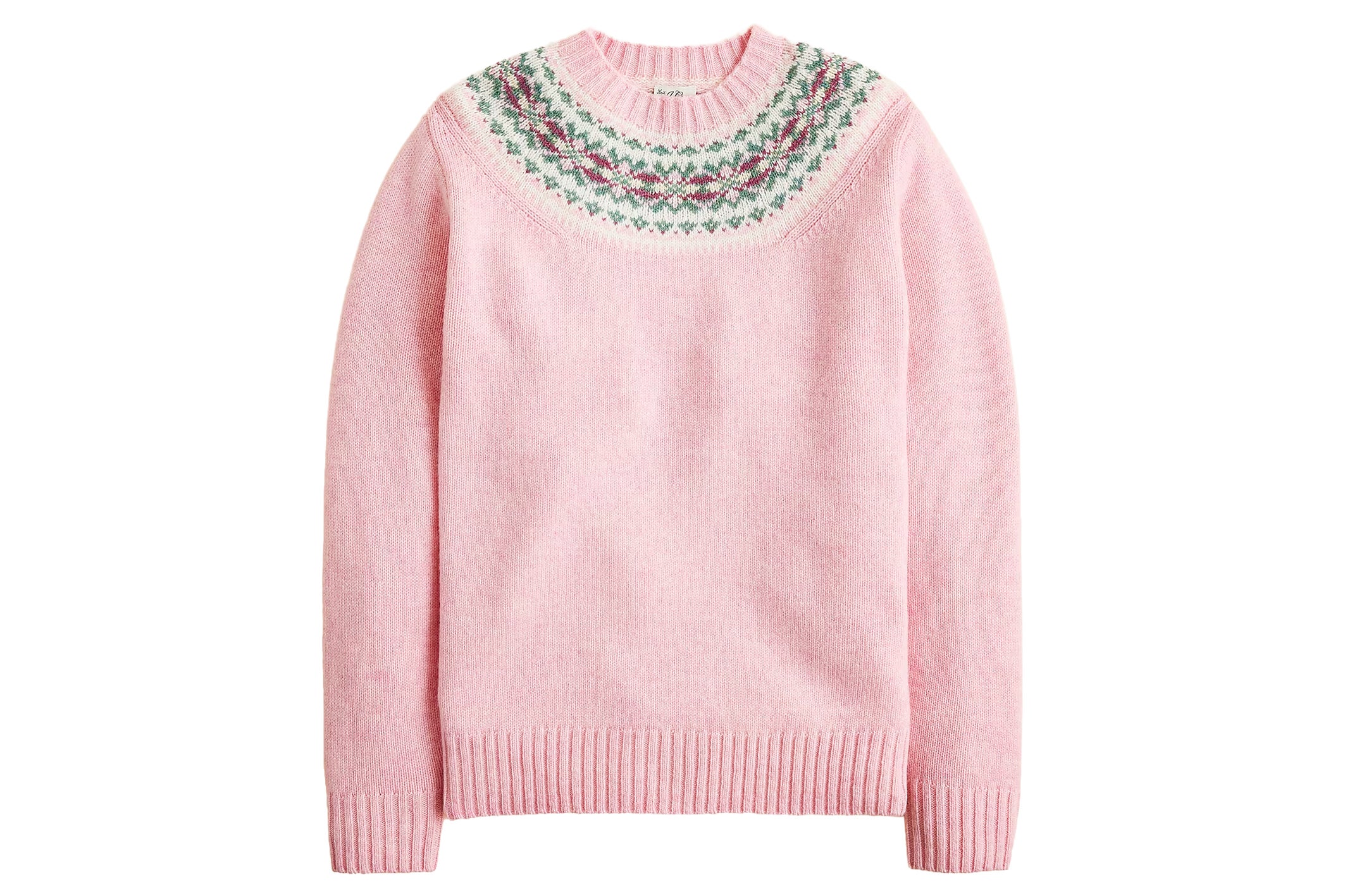 The pink wool pullover features ornate patterns woven near the neckline. J. Crew describes it as “festive” and “vintage-inspired.”
