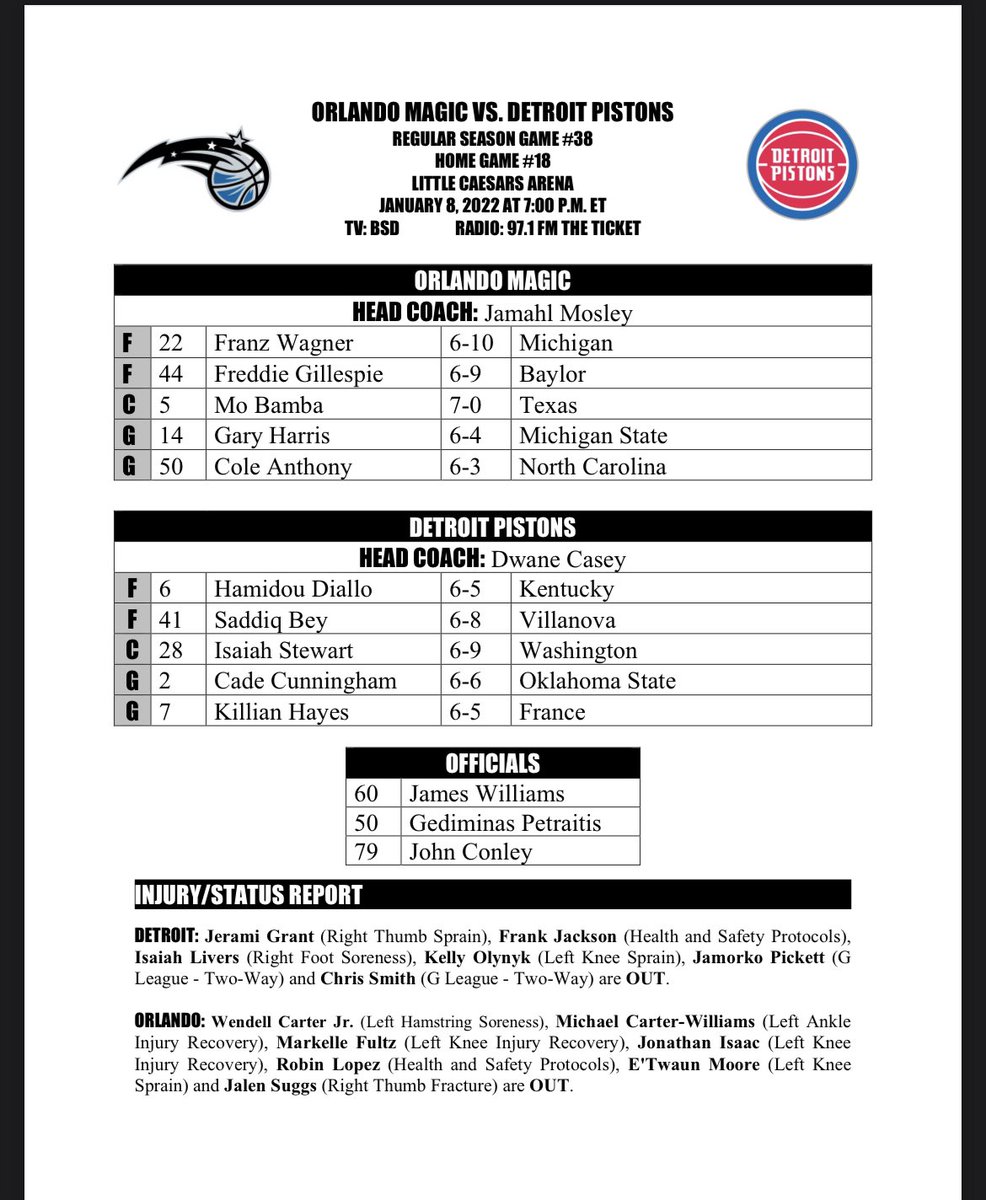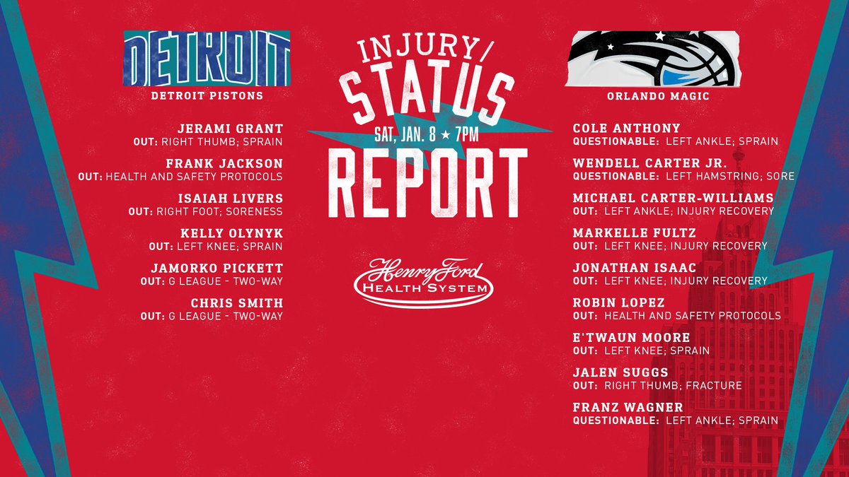 Tonight’s @HenryFordNews injury/status report against the visiting Orlando Magic: pic.twitter.com/DvFzlJhkRN5:50 PM