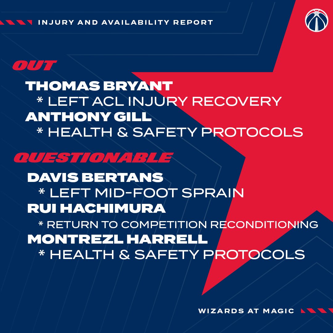 The Wizards are listing Davis Bertans (foot sprain), Rui Hachimura (return to competition conditioning) and Montrezl Harrell (health and safety protocols) as questionable to play Sunday in Orlando. Thomas Bryant (knee recovery) and Anthony Gill (protocols) are listed as out. – 6:02 PM