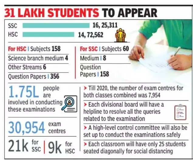 Examination centres have been increased to over 30,000 compared to 7,000 in regular times. A total of 14,72,562 stu- dents have registered for HSC exams while 16,25,311 students have registered for SSC exams.