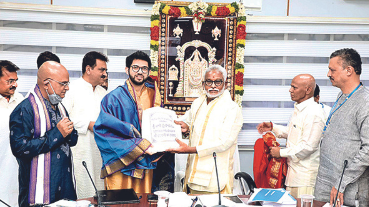 Maharashtra tourism minister Aaditya Thackeray handed over the land documents to TTD chairman YV Subba Reddy at Tirumala on Saturday.