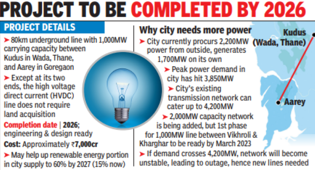 MUMBAI: With the state expecting Mumbai's electricity consumption to rise 5% every year, it has given Adani Electricity permission for a 80km, 1,000MW underground transmission line between Aarey in Goregaon and Kudus in Thane's Wada taluka under a 25-year build-own-operate licence.