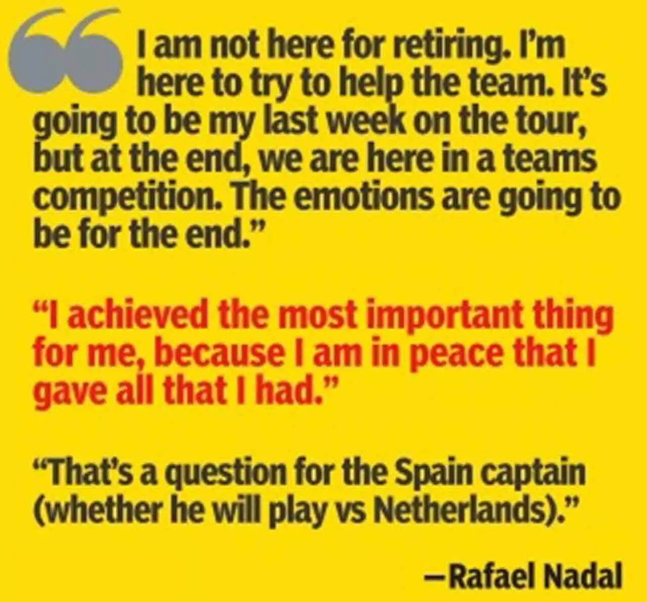 The Spaniard will look to supplement that in the Davis Cup Finals, starting Tuesday, which he has already won four times. Nadal will maybe play singles, likely only doubles, in what'll be his farewell tournament, but there won't be a dry eye in Malaga this week.