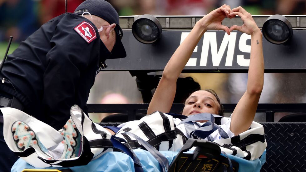 Swanson was carted off the field at Q2 Stadium and was taken to a hospital. She was the team’s leading scorer this year with seven goals as the United States prepares for the Women’s World Cup this summer.
