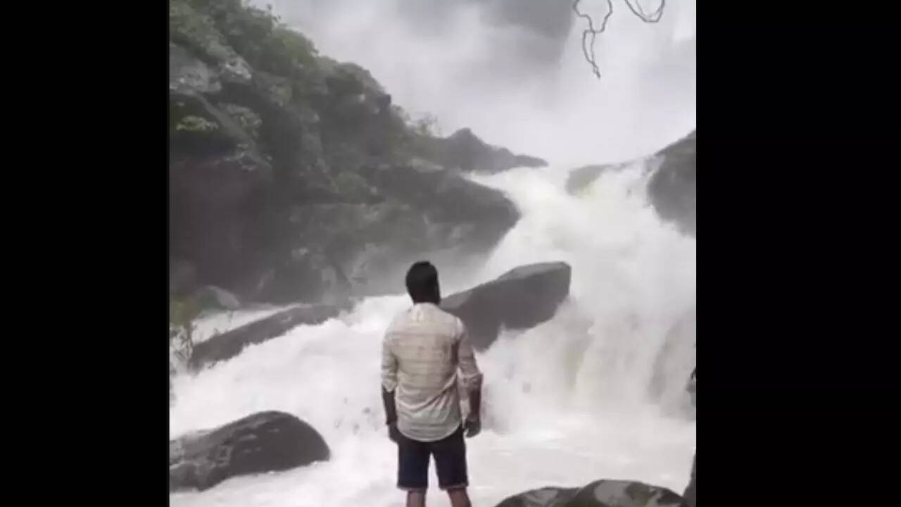 The man from from Bhadravati in Shivamogga district was standing on the rock when suddenly he slipped in the overflowing waterfall while his friend was making his video.