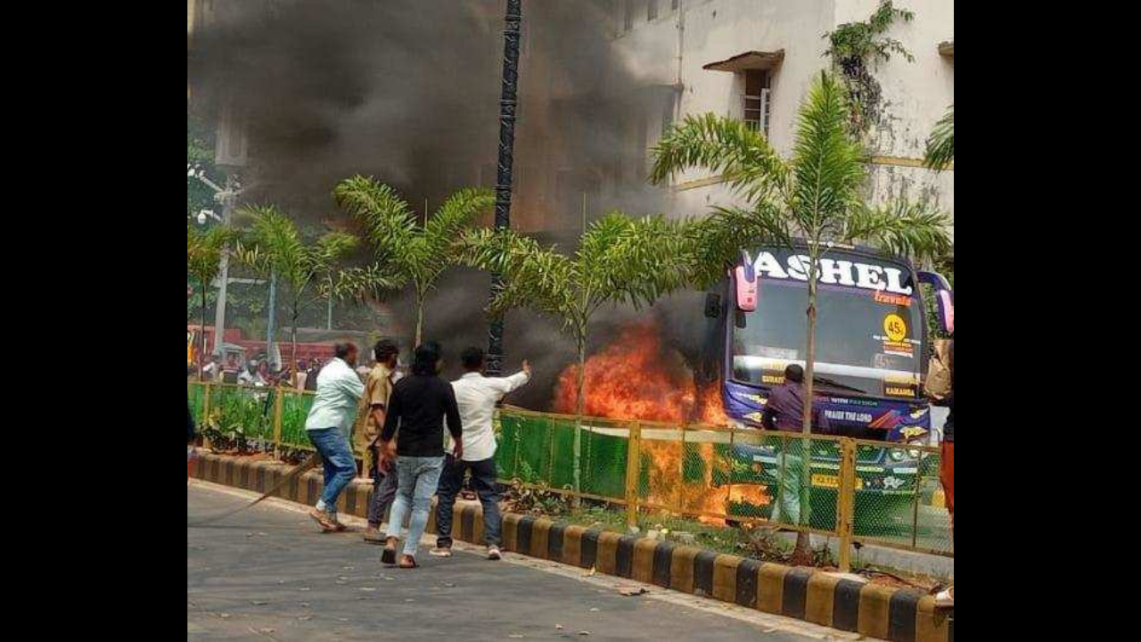 The city bus, which was moving from Ambedkar Circle to State Bank bus stand, reportedly ploughed a motorcycle and dragged it forward. The friction caused, and the damage to the petrol tank reportedly caused the fire. The seats and tyres of the bus have been destroyed in the fire.
