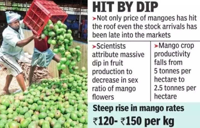 Scientists attribute the massive dip in fruit production to decrease in the sex ratio of mango flowers as a result of climate change. Mango crop productivity has fallen from approximately five tonnes per hectare to 2.5 tonnes per hectare in Telangana — a first in the state since its formation. This has led to a steep rise in mango rates which are sold in excess of ₹120-₹150 a kg.