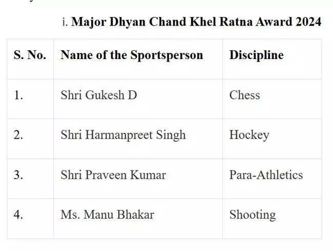 NEW DELHI: Ace shooter and multiple-time Olympic medallist Manu Bhaker, world chess champion D Gukesh, Indian men’s hockey team captain Harmanpreet Singh, and para-athlete Praveen Kumar have been announced as the recepients of the prestigious Major Dhyan Chand Khel Ratna Award -- the country's highest sporting honour.