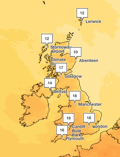But forecasters are predicting strong sunshine and highs of 20C across the country on Thursday, with southeastern areas expected to reach 22C, according to the Met Office. It will match high temperatures on the Spanish island of Ibiza, where the mercury is also set to get up to 22C.