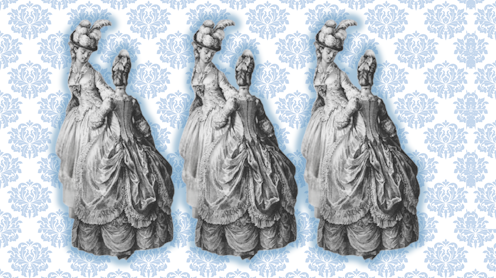 The wide skirts would have been open to reveal a longer petticoat underneath, or they might have been looped up with ribbons to form three layers in the popular “polonaise” style of the day.