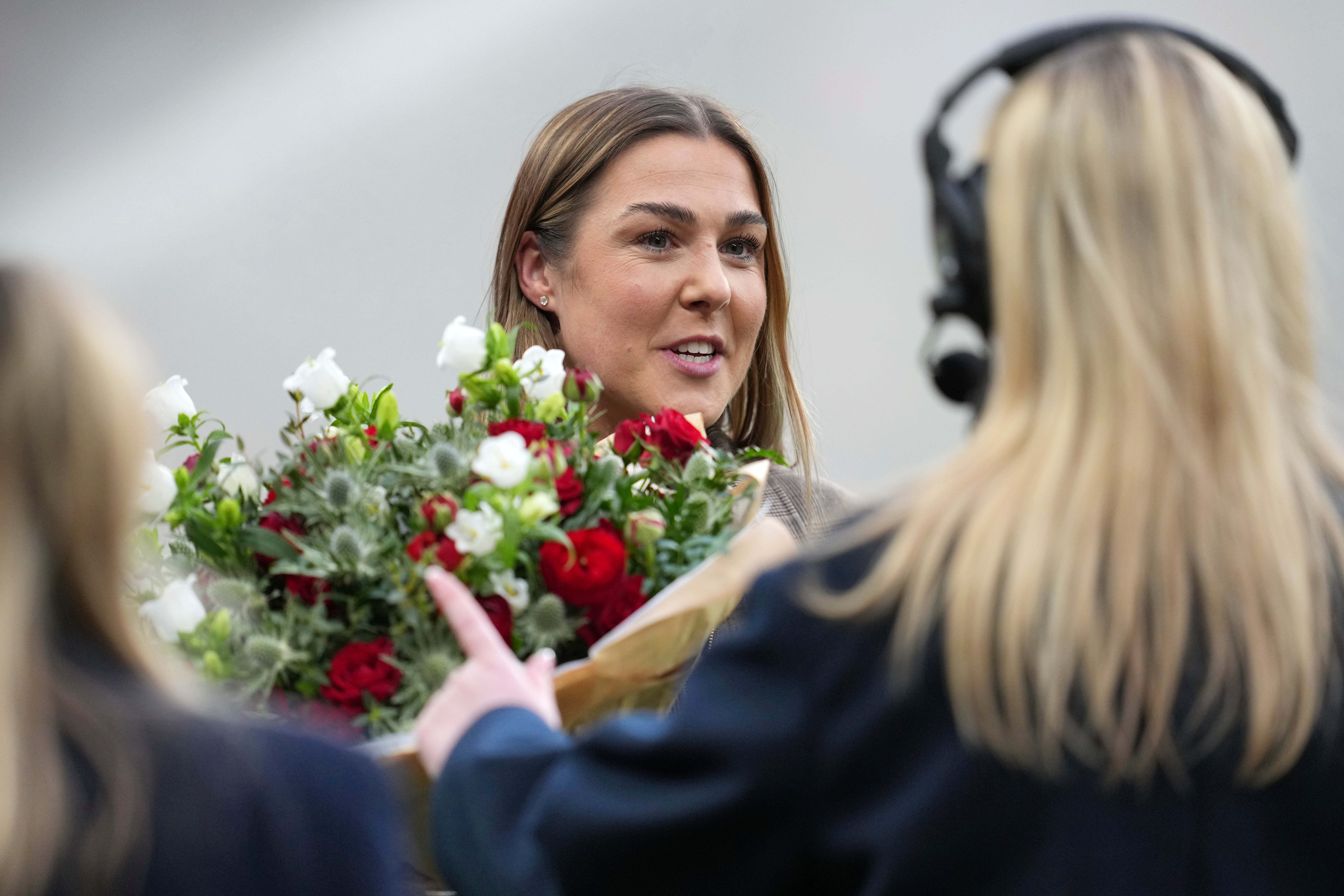 However on Tuesday there were loud cheers as she was presented with a framed shirt marking her 53 caps, as well as a bouquet of flowers on the pitch at Wembley to celebrate her contribution to the team.