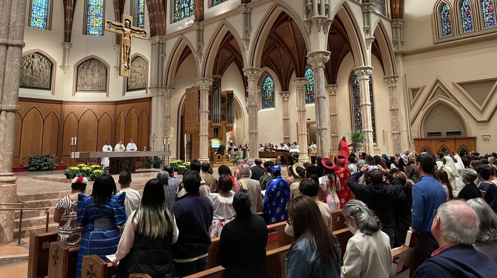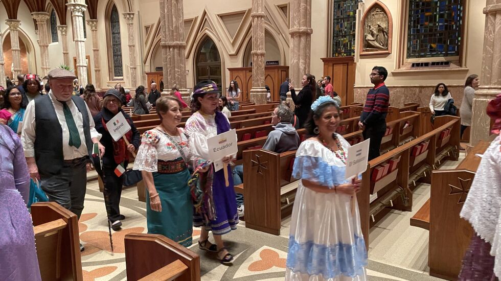A procession of more than 50 immigrants representing more than 25 countries, including Spain, Uganda and Mexico, walked through Holy Name Cathedral dressed in traditional attire to kick off the Sunday ceremony.