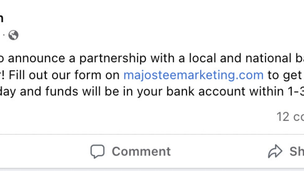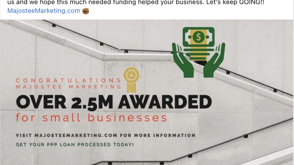 “Our team is proud to announce a partnership with a local and national bank to process PPP applications quicker!” Green posted on Facebook on Jan. 8, 2021. “Fill out our form on majosteemarketing.com to get in line for funding. We’re starting Monday and funds will be in your bank account within 1-3 days.”
