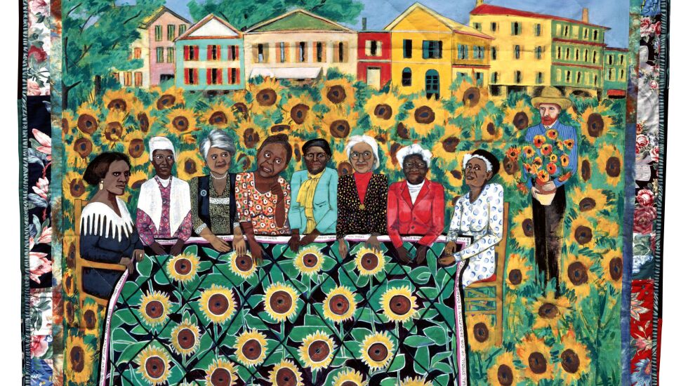 - Selections from the “French Collection” and “American Collection.” The exhibition features nine selections from these two pivotal 1990s quilt series, including “The Sunflowers Quilting Bee at Arles: The French Collection Part I, No. 4” (1991), acrylic on canvas, printed and tie-dyed pieced fabric.