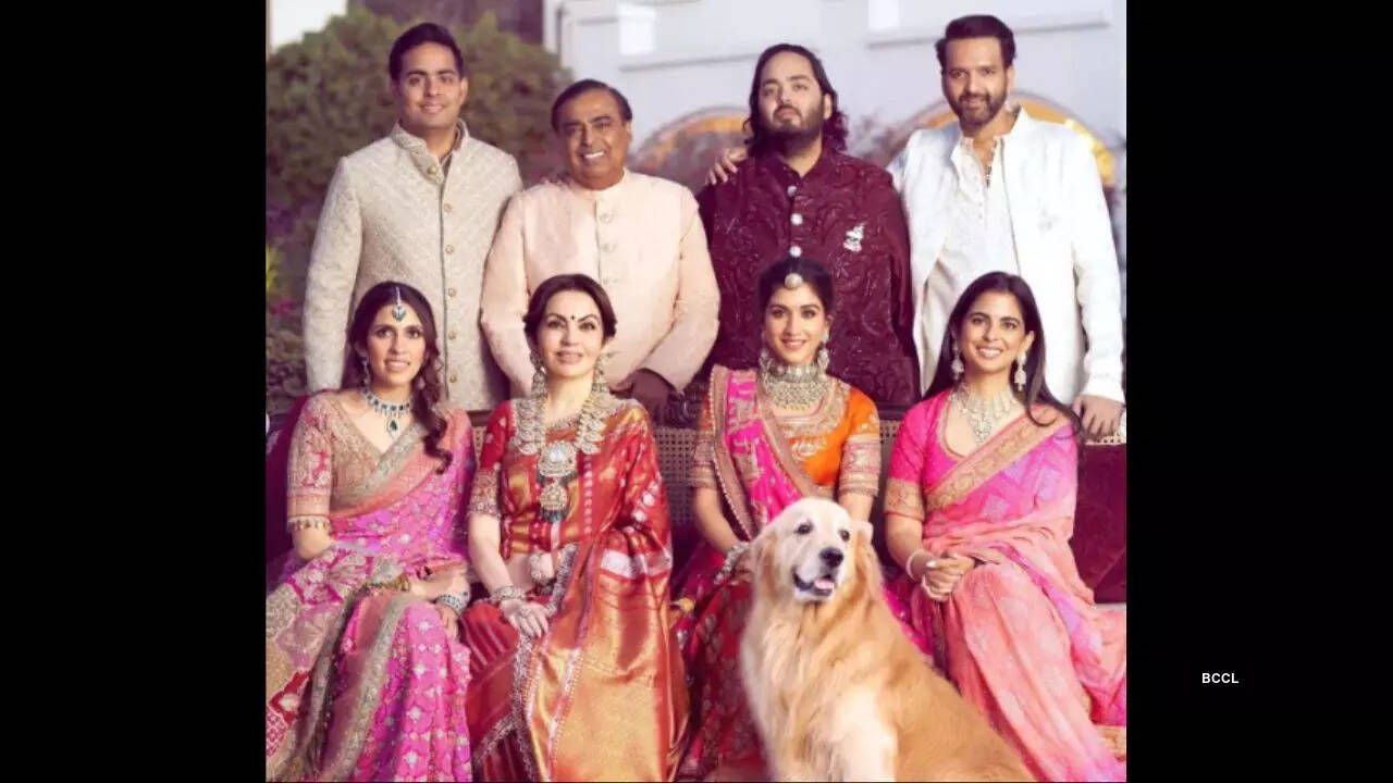 Amidst the pre-wedding celebrations, the Ambanis also clicked several pictures of their family. But what grabbed people's attention and touched their hearts was the presence of their cute pet dog in one of the family photos. In the picture, one can see India's richest person- Mukesh Ambani with his wife Nita, their daughter Isha Ambani with her husband Anand Piramal and twins- Krishna and Aadiya, their elder son Akash Ambani with his wife Shloka Mehta and two children- Prithvi and Veda, and their youngest son Anant Ambani with his to-be wife Radhika Merchant. However, it is their beloved golden retriever, named Happy, who completes steals all the attention!