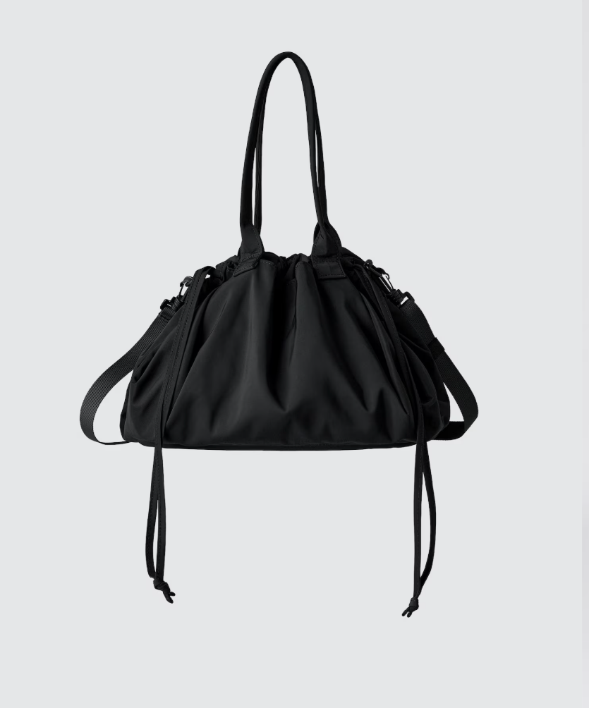 The bag, called the drawstring bag on Uniqlo’s website, comes in four colors. With its two-way design, the clutch can either be worn as a larger tote bag or cinched in the sides to create a smaller, dumpling-shaped bag.