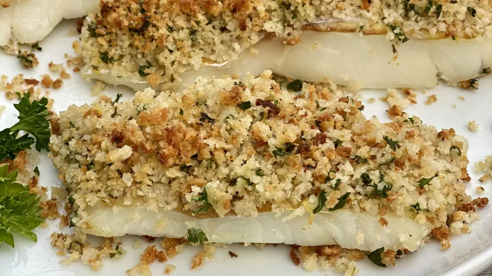 Heat oven to 425 degrees. Line a shallow-sided baking sheet with parchment paper. In a bowl, combine panko, butter, parsley, lemon zest, garlic powder, salt and pepper. Arrange fillets on prepared baking sheet and brush tops with Dijon. Top with breadcrumb mixture, pressing gently to adhere. Bake 10 to 12 minutes or until fish is cooked through and flaky and breadcrumbs are golden. Serve with lemon wedges.