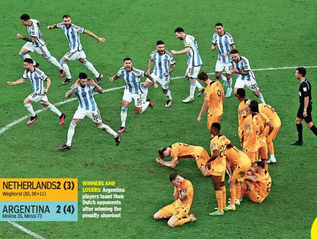 The Dutchmen in their yellowish orange were strewn in the centre-circle, in that kind of helpless sprawl that you don’t like to be, but simply cannot lift yourself either. The crushing sleep paralysis in the full glare of the world. The Argentines in their pale blue, were running past, a new life, a new wind, making faces at their fallen opponent as they ran towards Lautaro at the far end, celebrating before the delirious Argentine faithful as if he had just conquered the world.