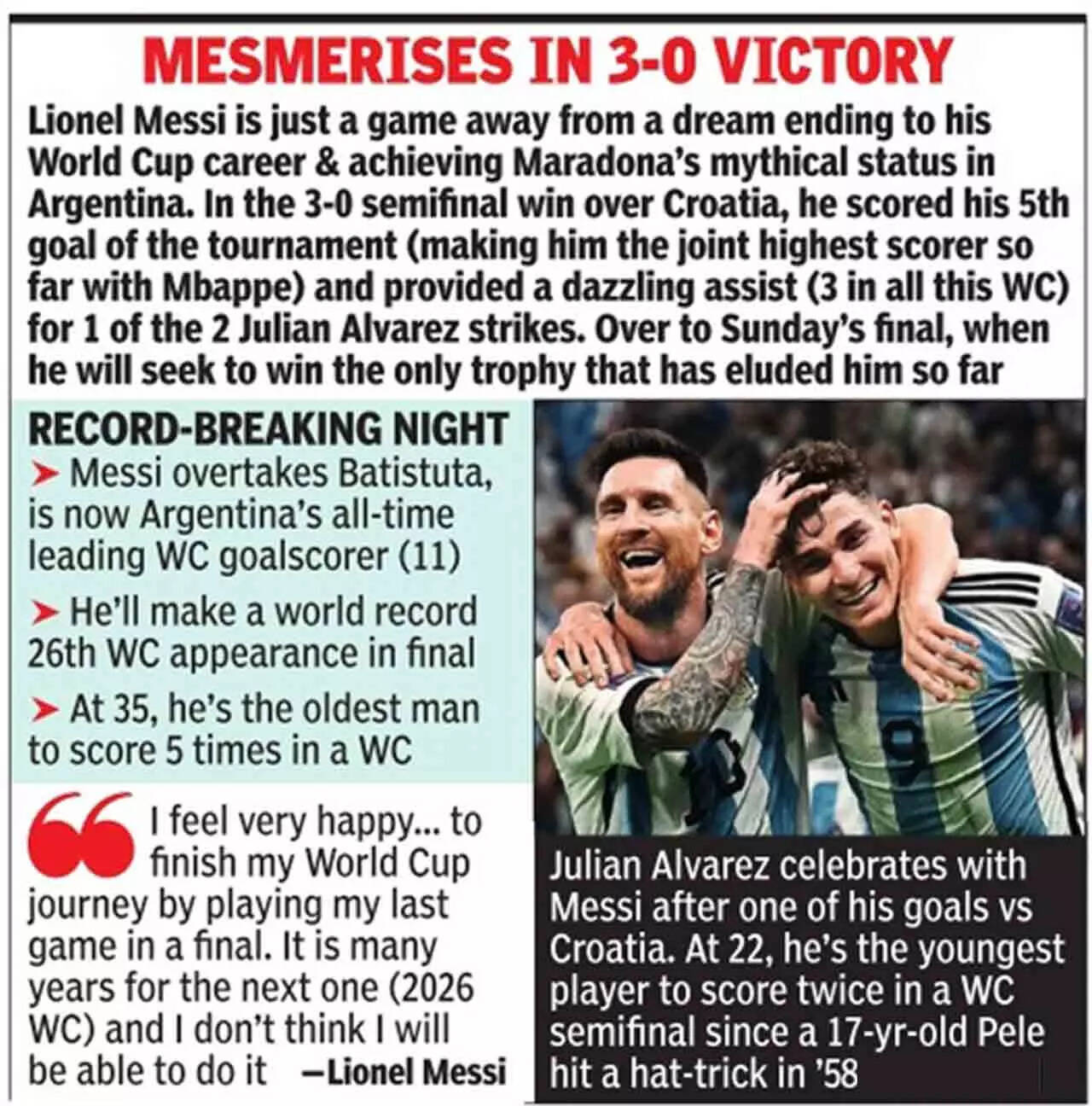 “I am very happy for finishing my journey in the World Cups in a final, to play the last game in the final. That is really very gratifying,” he would say. “Everything I lived in this World Cup has been emotional, seeing how much it has been enjoyed in Argentina. There are a lot of years from this year to the next one (in three-and-half years he will be 39). I don’t think I will be able to do that.”