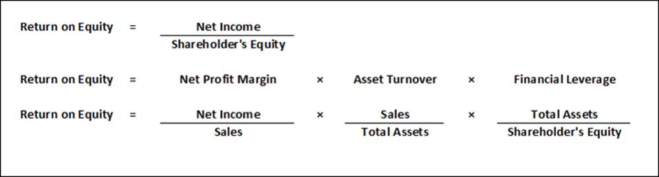 Return on equity can be simply stated as net income divided by common stockholder’s equity. However, return on equity can be broken down into three components: net profit margin, asset turnover and financial leverage. Multiplying these three components together results in return on equity.