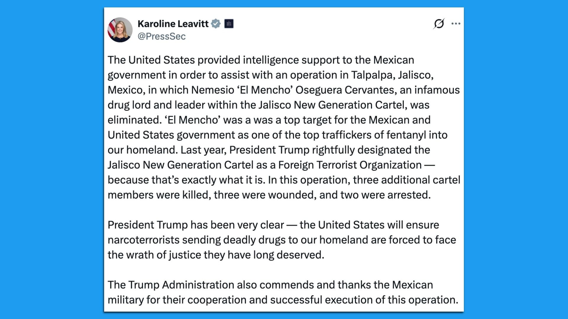 - White House spokesperson Karoline Leavitt confirmed via X later Sunday that U.S. intelligence had provided "support to the Mexican government" to assist in the operation.