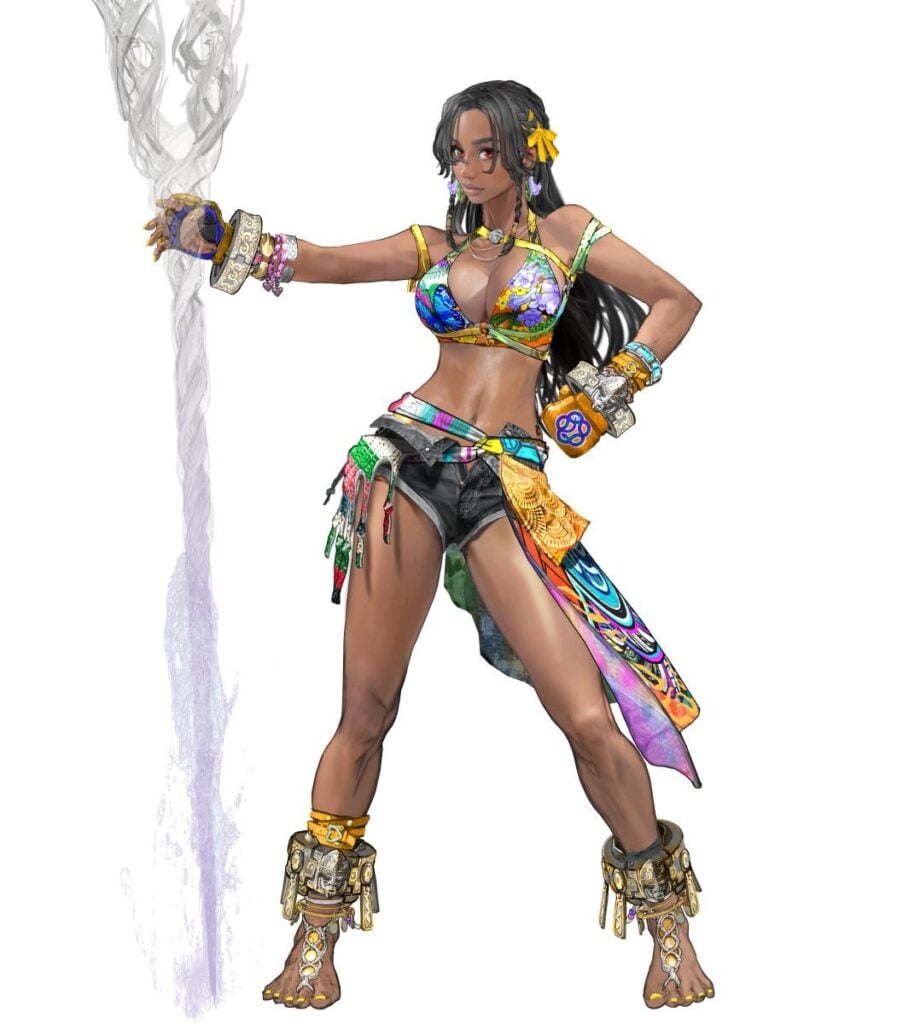 For the Default 3 outfit, Bandai Namco brought in Mari Shimazaki, the designer behind Bayonetta, Tekken 8’s Reina, and many other characters. She was given the direction of “child of the fighting god” from Africa, and granddaughter of a wise fortune-teller. Shimazaki proposed a miko-style outfit, based on the Japanese idea of shrine maidens who serve the gods. She added gold accessories and pushed for changes on Miary Zo’s facial expressions and hairstyle, including the distinctive shaved section at the back. Those choices fed back into the face design, influencing her overall look, and not just the third outfit.