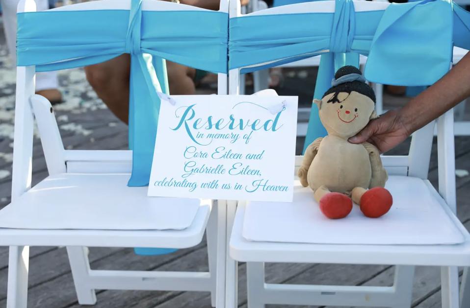 The sign says, "Reserved in memory of Cara Eileen and Gabrielle Eileen, celebrating with us in Heaven." Regina Fleming Photography