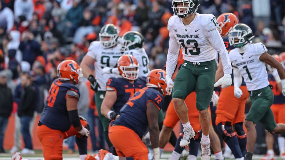 On the very first play from scrimmage, though, Spartans quarterback Payton Thorne threw into the wind and was intercepted by Illini safety Sydney Brown. Here we go again, right? Nope. The Illini drove to the 2-yard line before turning the ball over on downs — something they’d do four more times before the game was over.