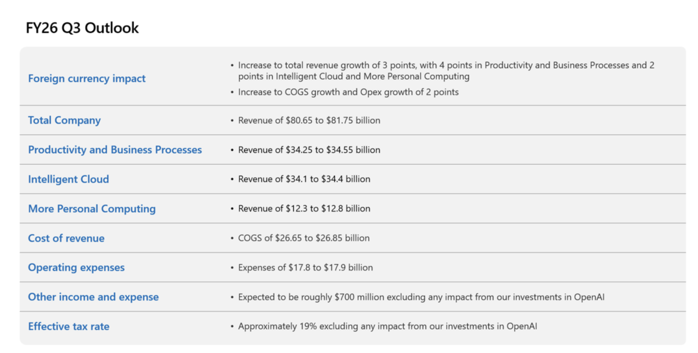 Microsoft shared some of its outlooks for its earnings in the next quarter. You can see it all at the company's investor relations website (and some of the key info above), but the key thing that's most interesting is that the company expects to see revenue of $80.65 billion to $81.75 billion.