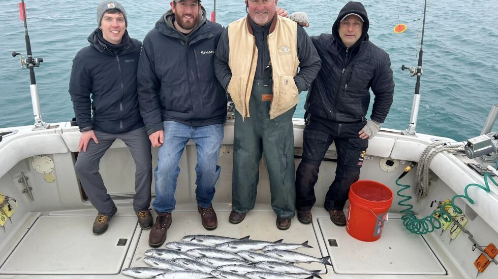 At North Point, he called it, “Lock and load, just ridiculous. There’s a band from Waukegan to Racine [Wis.]” On Monday, catching was in 17 feet in front of the old nuke plant; generally, it’s been in 14-25. “Lots of bait and coho,” including one to 19 inches.