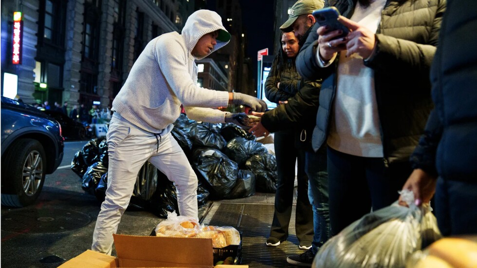 Phillips and the other volunteers pulled up at the homeless shelter — a hotel turned city shelter — a block east of Times Square around 6:40 p.m. Migrants streamed out of the hotel and began picking through sweaters, fleece blankets and snacks inside the boxes.