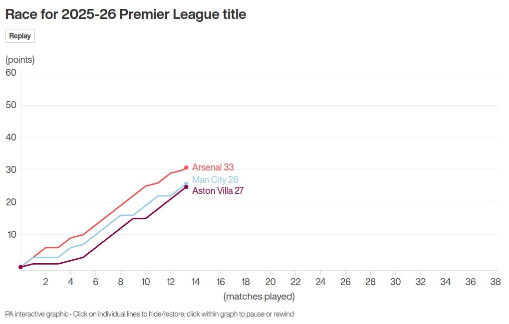 Arsenal are now only five points ahead of Manchester City having played a game more and have now won just two of their last seven league matches.