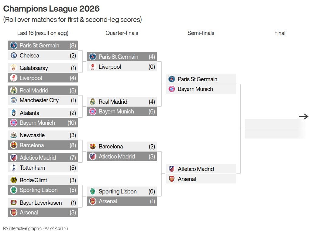 But for the second season in a row, Arsenal are the only Premier League team left standing in the last four of the Champions League.