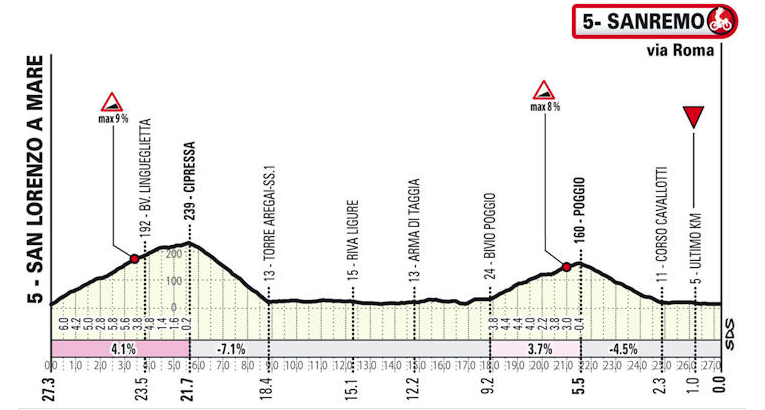 A further 11km down the road the race hits the first of two bigger climbs, the Cipressa (5.6km at 4.1%), which is followed 12km later by the Poggio (3.7km at 3.7% - a simple stat to remember).