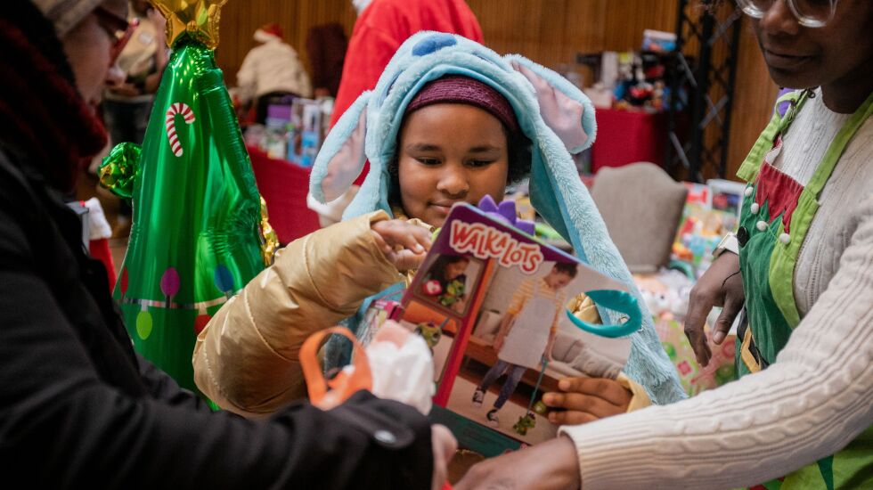 “This is the last one I needed,” said the 10-year-old, holding up a Black Panther figurine. “I already got Spiderman, Ironman, Hulk, She-Hulk.” Trophy in hand, Joseph followed his grandmother to the room where winter gear and food were being given out.
