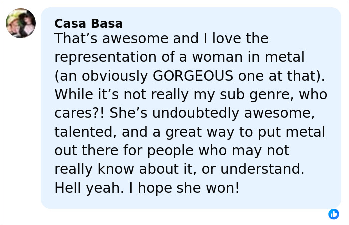 Many agreed, stating that she proved that beauty and strength could coexist. “Proof you can be gorgeous and feminine but still metal,” one commenter said.