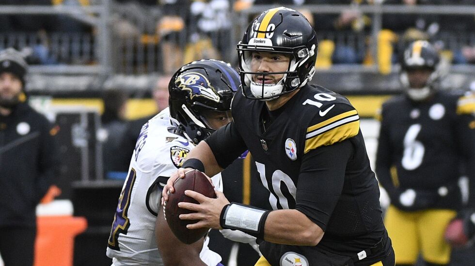 Quarterback Mitch Trubisky signed a three-year contract with the Steelers to remain the backup behind second-year starter Kenny Pickett. (Don Wright/AP)