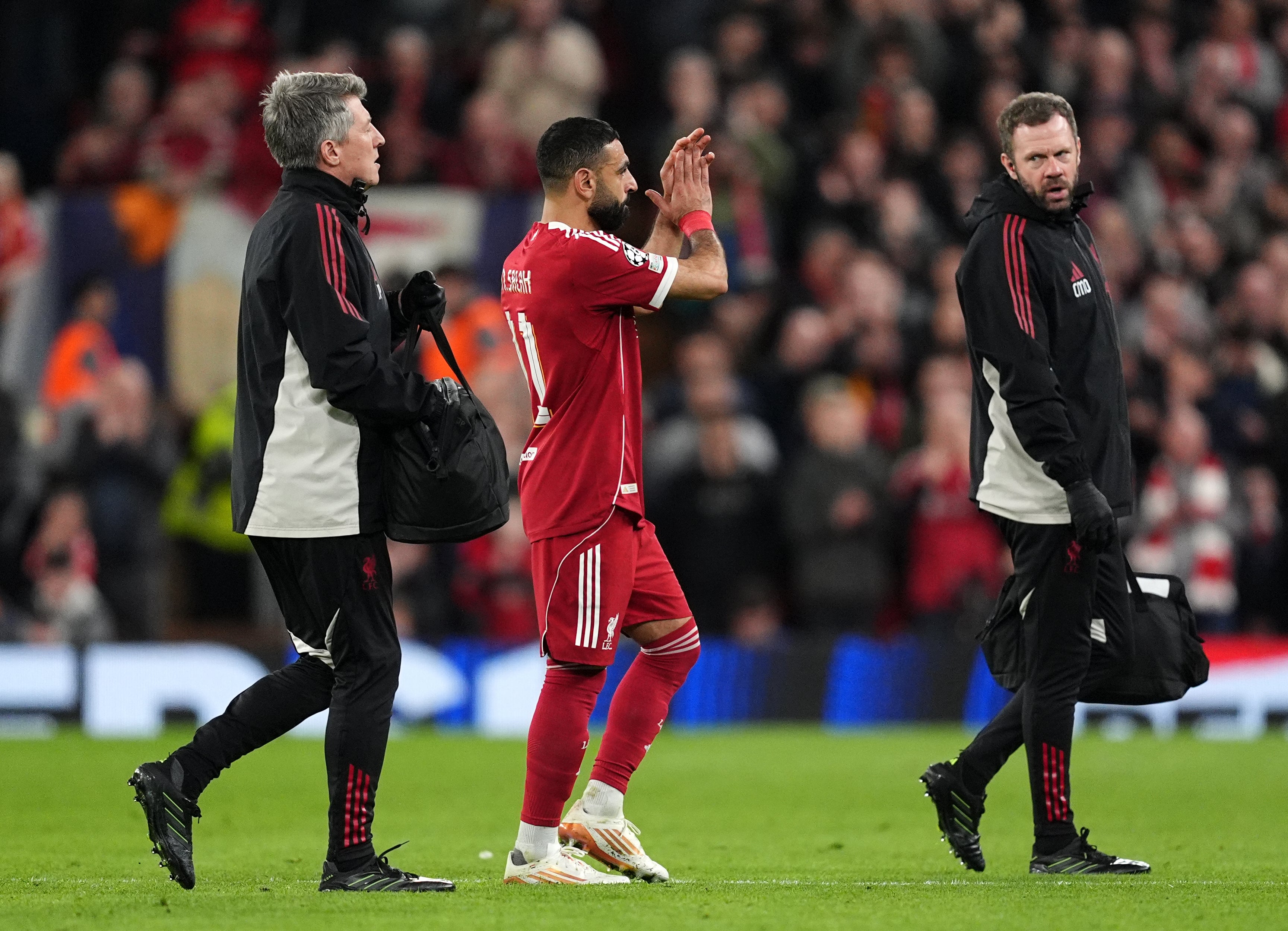 Liverpool’s Mohamed Salah applauds the fans as he leaves the game with an injury (Martin Rickett/PA) (PA Wire)