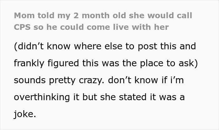 The distraught mom recently shared her story online. According to her, the grandmother was undermining her every parenting decision for the two months she’d had the baby. She wasn’t sure whether she would take this and her other comments to heart or if she was just overreacting. But folks online justified her worries, calling out the grandma for her weird behavior.
