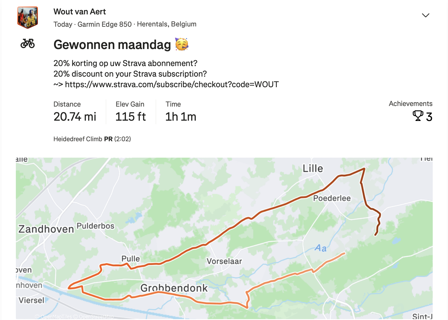 The Visma-Lease a Bike rider posted the 33km ride on his Strava account, calling it 'Monday's Victory'. Despite the fact the ride was his first since surgery, he still managed a personal best on the Heidereef Climb segment, though he was way off the overall best time.