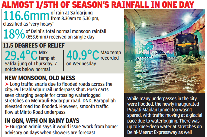 NEW DELHI: The southwest monsoon arrived in Delhi-NCR with a huge splash, bringing “very heavy” showers to a capital desperate for relief from a killer spell of high heat and humidity. Safdarjung recorded 116.6mm — nearly a fifth of the total monsoon rainfall from June to September — in just nine hours from 8.30am on Thursday.