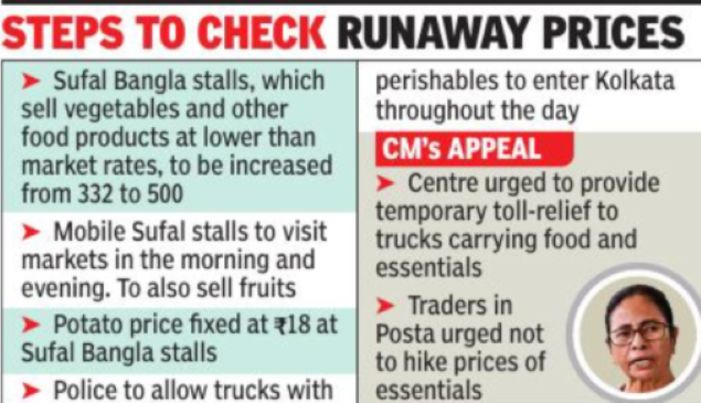 The number of Sufal Bangla stalls, which sell 177 vegetables and other food products at lower than market rates, will be increased from 332 to 500 — a more than 50% jump — across the state. The state government had introduced these stalls in 2014, after a runaway rise in the price of onions and potatoes. Banerjee on Thursday urged officials to deploy unused buses for mobile Sufal Bangla stalls.