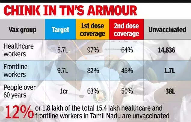 CHENNAI: The Tamil Nadu government has made a big push for Covid vaccination, but more than half its own 9.7 lakh frontline workers have not taken both doses. Worse, nearly 1.7 lakh or 18% of these workers, who include policemen, revenue officials and local body staff, have not taken even a single dose of the Covid vaccine.