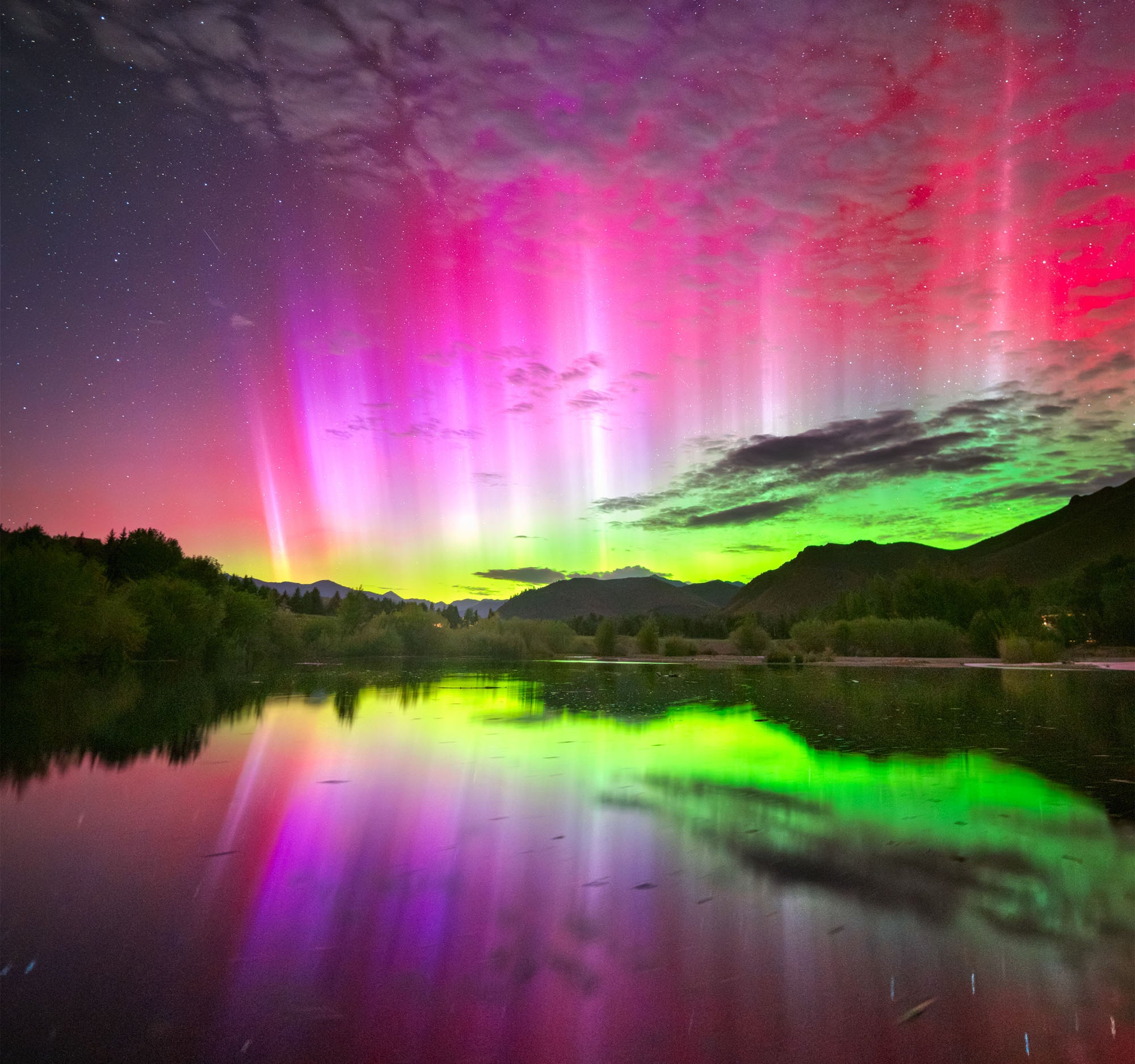 He described the stunning image as showing “an explosion of color,” with “vibrant red flares intertwined with the colors of the aurora reflecting off a tranquil pond.”