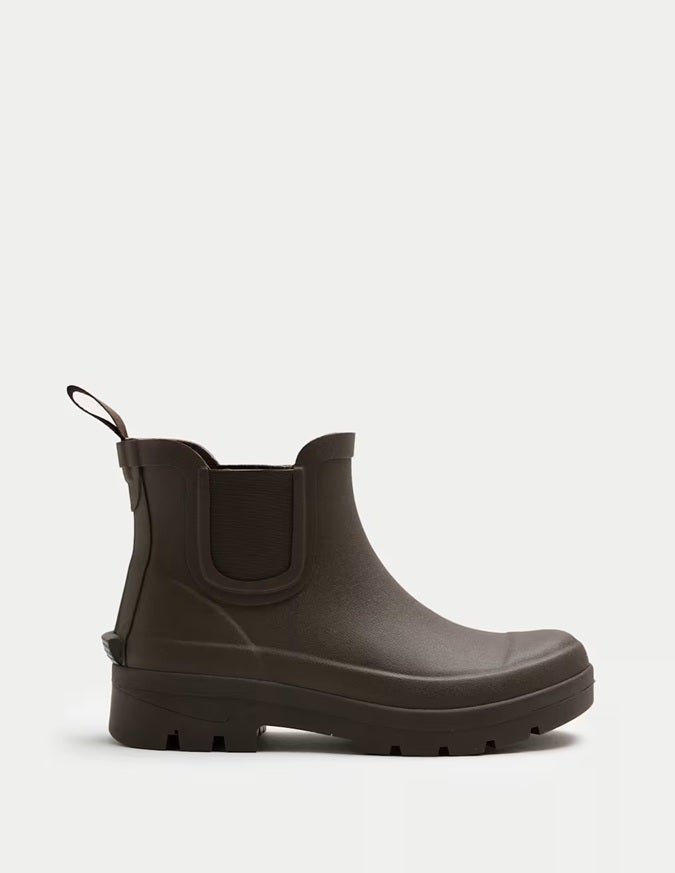 A sleek black or deep brown rain boot can sit comfortably alongside tailoring.