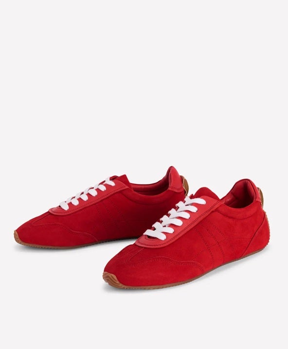 She references the red patent trainers seen at Dries Van Noten’s spring/summer 2026 show as an example of how bold colour can change the whole vibe of a shoe.