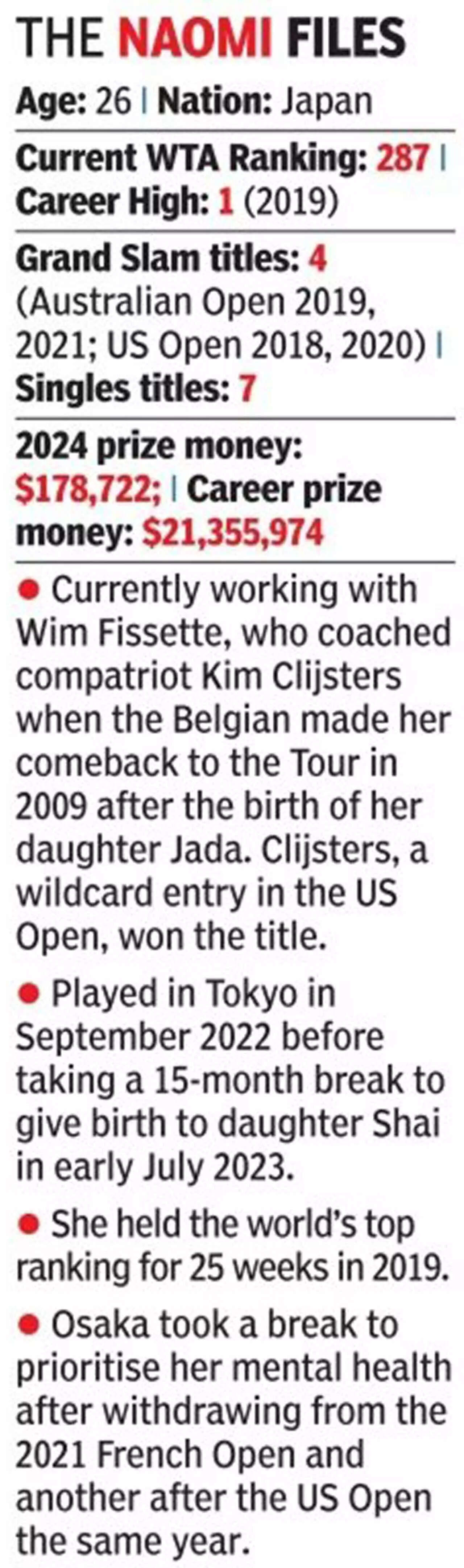The first order of business when Osaka started training was to make the call to her former coach Wim Fisette, who had parted ways with her in July 2022, when her appearances on the court became few and far between. The Japanese signed on performance coach Florian Zitzelsberger. She has a new hitting partner in Canadian Philip Bester.